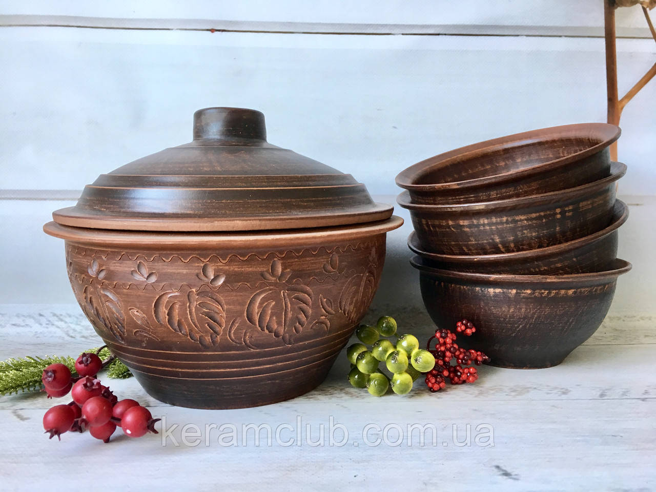 Набір складається з глиняної супниці V 2,5 л із декоративною різзю і 4 тарілок кисе V 600 грамів. Ідеально підходить для запікання в духовці спекотного та подавання перших і других страв. Тарілочки можна використовувати як салатниці. Посуд із червоної глини є на 100% екологічно чистим. Якщо Ви дбаєте про своє здоров'я і здоров'я своєї сім'ї, користуйтеся нашими виробами з червоної глини! До набору можуть входити як 4 тарілочки, так і 6 шт. Вони також можуть бути з декоративною різзю.